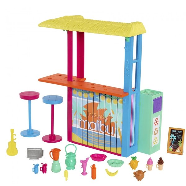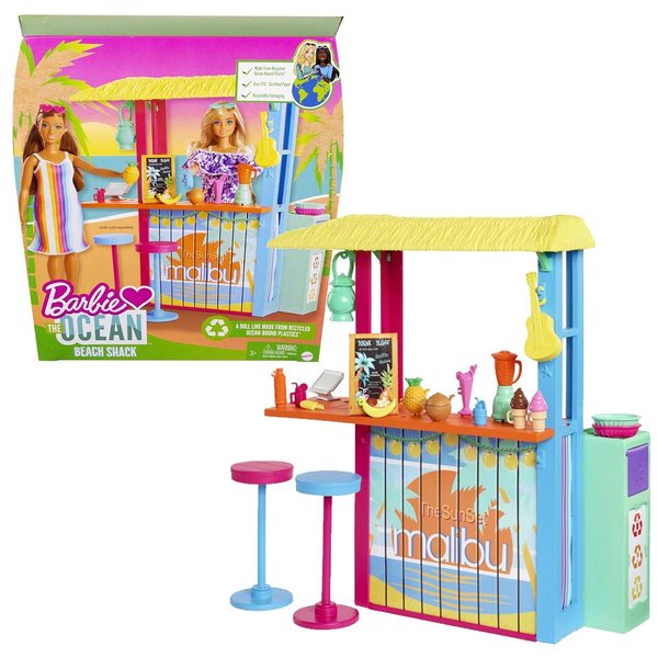 Vá para a praia e tenha o dia perfeito de verão com este playset Barbie Ama o Oceano Quiosque de Praia, feito de plástico reciclado. Com mais de 18 acessórios, incluindo bebidas inspiradas na ilha, casquinhas de sorvete, liquidificador e lanches, a Barbie Quiosque de Praia é o lugar perfeito para se refrescar e desfrutar de uma deliciosa guloseima em um dia quente!