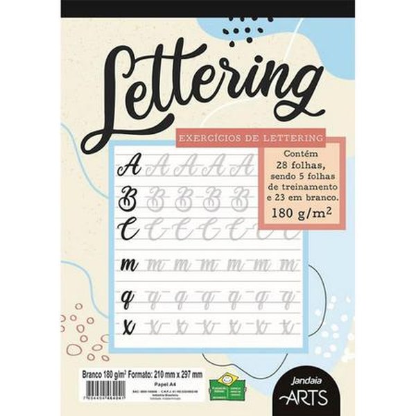 Bloco Lettering A4 180g Jandaia Arts 28 fls, sendo 5 folhas de exercícios e mais 23 folhas para colocar sua criatividade em prática. Este Bloco foi criado em parceria da artista Patrícia Costa, do blog Tipopaty, especializada em lettering.