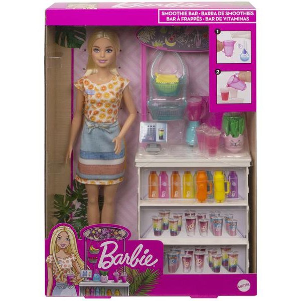 É hora de fazer deliciosos smoothies e servir os clientes com o playset Barbie Smoothie Bar! Usando um vestido fofo com tema de frutas e avental, a boneca Barbie (30,40 cm) tem todos os acessórios prontos, muitas frutas e vegetais e até um pote de gato de grama de trigo, para fazer smoothies saborosos para ela clientes! As crianças vão adorar fingir que ajudam a boneca Barbie a fazer smoothies, usando um liquidificador, frutas e copos para viagem.