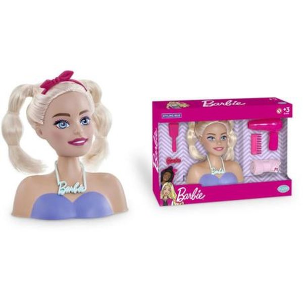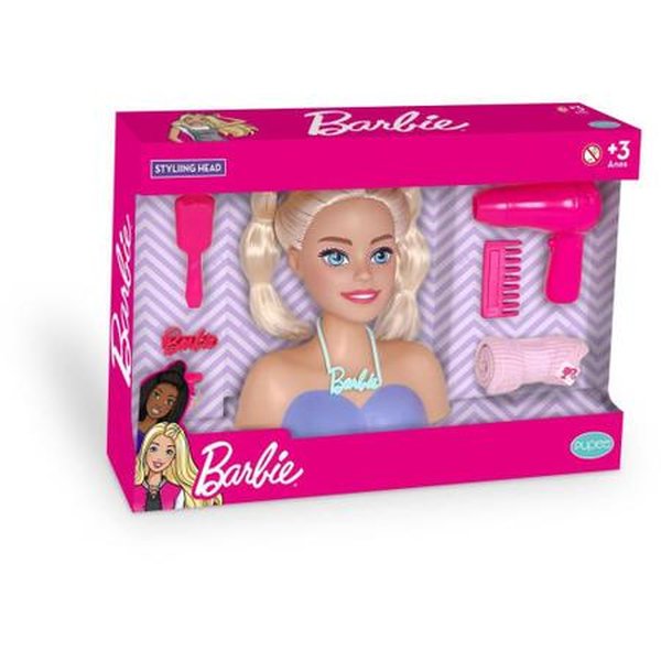 • A última linha de bonecas Barbie® Styling Head Brush inclui 01 Mini Escova, 01 Presilha Logo Barbie, 01 Pente, 01 Secador, 01 Toalha e 10 Elásticos de Silicone.