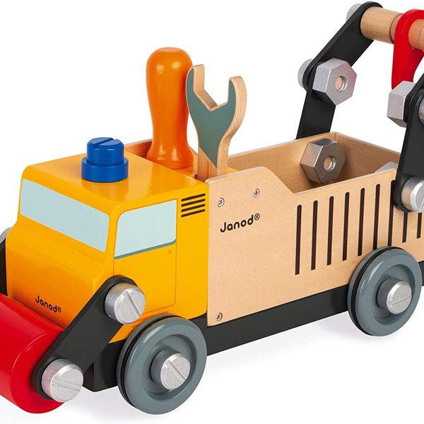 Este conjunto de 43 peças inclui 2 ferramentas para montar o veículo e instruções completas de montagem. O caminhão é feito de madeira.
