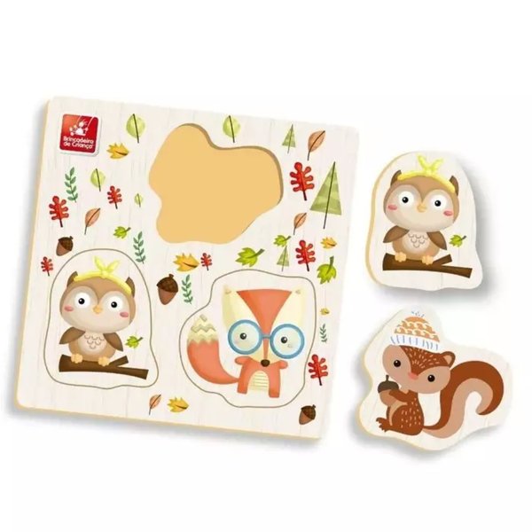 O brinquedo para encaixar e montar conta com 4 peças, é fabricado em madeira de alta qualidade e garante muita diversão! O brinquedo contém um lindo cenário de floresta, onde seu pequeno pode usar e abusar da criatividade! Contém 4 peças: uma base, um esquilo, uma coruja e uma raposinha.