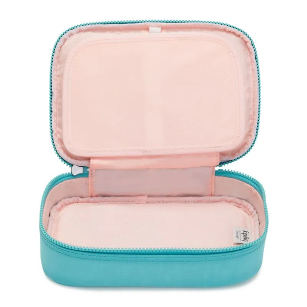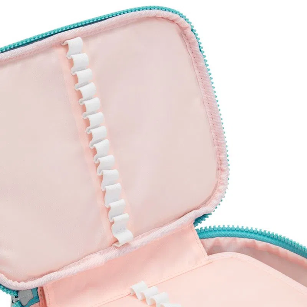 O 100 Pens é um estojo estruturado e espaçoso, com uma divisória central que possui elástico para acomodar lápis e canetas. O modelo é ideal para o dia a dia escolar ou até mesmo para guardar maquiagem.