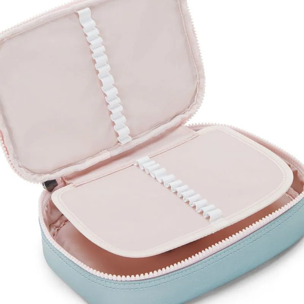 O 100 Pens é um estojo estruturado e espaçoso, com uma divisória central que possui elástico para acomodar lápis e canetas. O modelo é ideal para o dia a dia escolar ou até mesmo para guardar maquiagem.