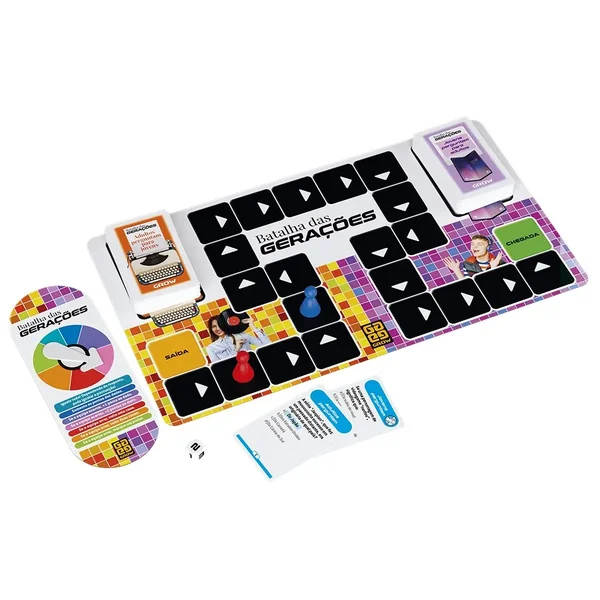 O Jogo Batalha das Geraçõesda Grow é um jogo de perguntas e respostas que desafia os jogadores a testarem seus conhecimentos sobre diferentes gerações. Ideal para toda a família, ele traz questões sobre cultura pop, história e curiosidades, divididas entre gerações passadas e atuais. Quem souber mais sobre as décadas antigas e atuais vai se dar bem, mas para isso, será preciso estar atento ao formato dinâmico e divertido do jogo. Prepare-se para se surpreender com as diferenças e semelhanças que atravessam o tempo!