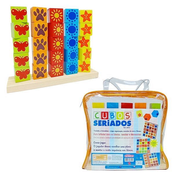 O Jogo Cubos Seriados é um brinquedo educativo em madeira produzido pela Carimbras. Ele consiste em um conjunto de cubos de tamanhos variados e núcleos vibrantes que podem ser encaixados uns nos outros para formar diferentes sequências e padrões.
