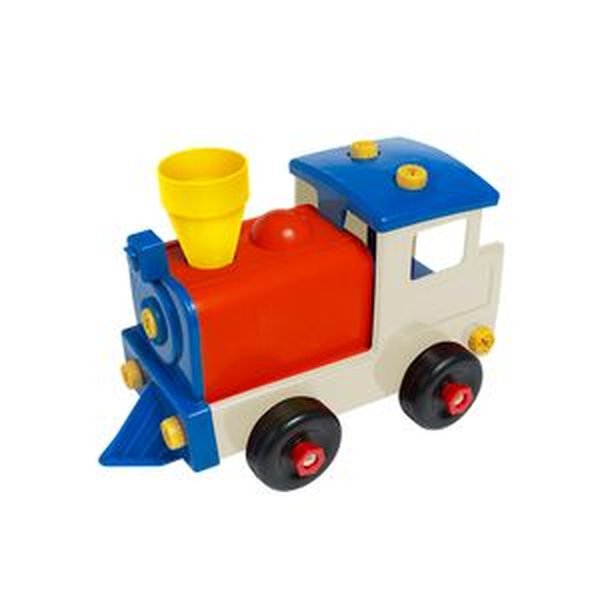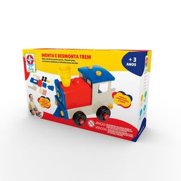 Um trem para a criança montar e desmontar peça por peça quantas vezes desejar, com auxílio de ferramenta, virando um carro de roda livre.
