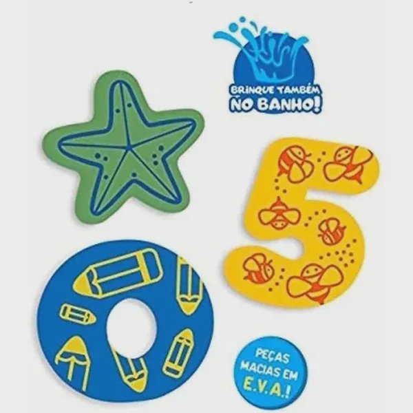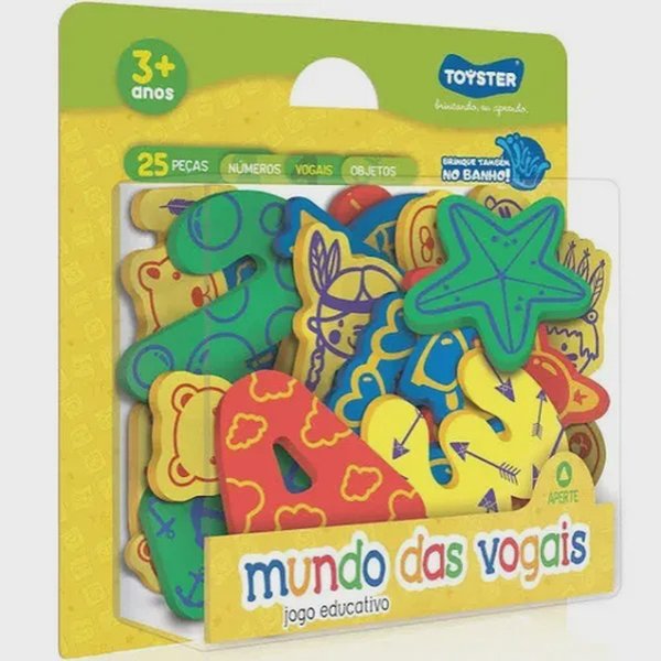 Conheça o colorido mundo das vogais! Com peças macias de EVA no formatos de vogais, números e objetos para brincar.