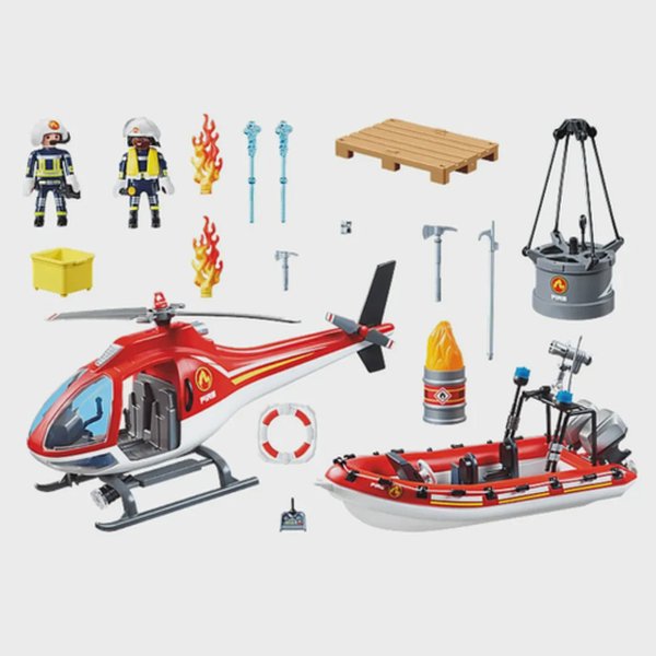 Playmobil Missão de Resgate Bombeiros Sunny 70335 O recipiente do helicóptero para o combate a incêndios pode ser enchido com água e esvaziado. O barco é flutuante! Seja na água, em terra ou no ar, os bravos bombeiros da PLAYMOBIL estão sempre prontos para ajudar em caso de emergência. Um barril de óleo pegou fogo no mar. O piloto sai imediatamente no helicóptero de incêndio. Primeiro o recipiente de combate ao fogo é enchido com água, depois vai para a zona de perigo. Seu colega já está no local no barco de bombeiros e está tentando controlar o fogo. Com as forças unidas, eles conseguem combater o fogo com sucesso.
