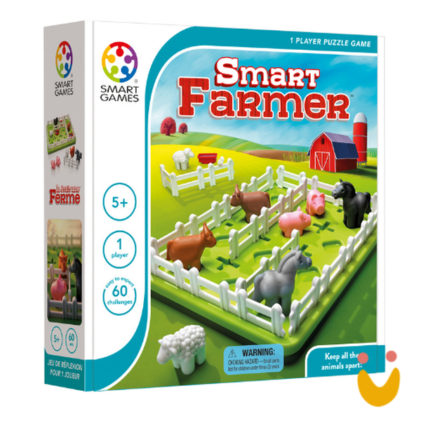 Conteúdo: tabuleiro de jogo, 3 cercas, 2 vacas, 2 cavalos, 2 porcos, 2 ovelhas, um livreto com 60 desafios.